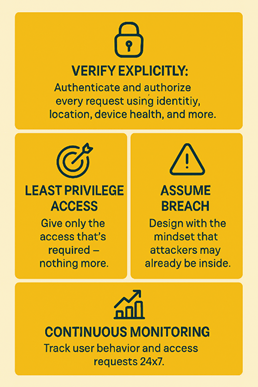 Every device, every user, and every connection is considered potentially hostile until proven safe. This means identity, device health, and permissions are checked every time, not just once at login.